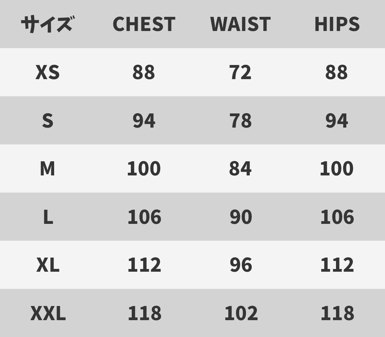 【XXL】:胸囲118cm|ウエスト102cm|ヒップ118cm